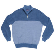 Elevate your style with the Medium Blue Heather Sweater, featuring a refined half-zip design. This sweater showcases a unique woven heathered pattern with a solid top and sleeves, while the body knit displays a heathered texture for added dimension. Perfect for layering this versatile piece offers both comfort and sophistication, making it an essential addition to your fall and winter wardrobe. Whether for casual outings or smart-casual occasions, this sweater combines modern style with classic comfort.