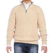 Stay cozy in style with the Oatmeal Ribbed Cotton Blend Half Zip. This sweater features a ribbed design and a contrast color on the inside collar for a refined touch. Slightly thicker than our classic half zip, it’s the perfect layer for colder days or winter getaways. Made from a high-quality blend of 60% cotton, 30% nylon, and 10% wool, it offers a soft feel with added warmth and durability. Whether you’re dressing it up or keeping it casual, this half zip sweater combines comfort and style, making it a versatile addition to your winter wardrobe.